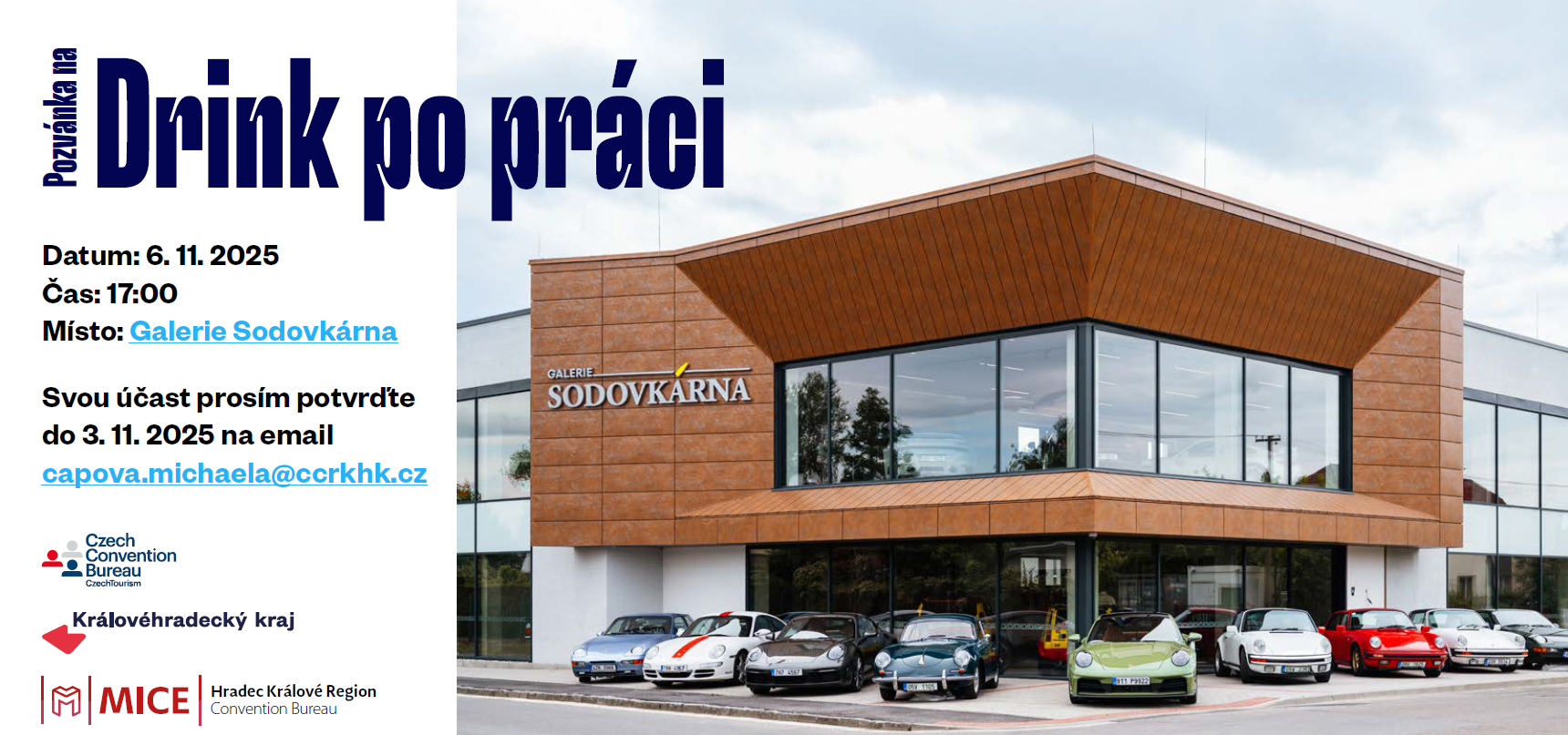 Přijměte pozvání na networkingové setkání „Drink po práci“, které pořádá kongresová kancelář Královéhradeckého kraje. Akce se uskuteční 6. listopadu 2025 od 17:00 v unikátním prostoru Galerie Sodovkárna v Hradci Králové.