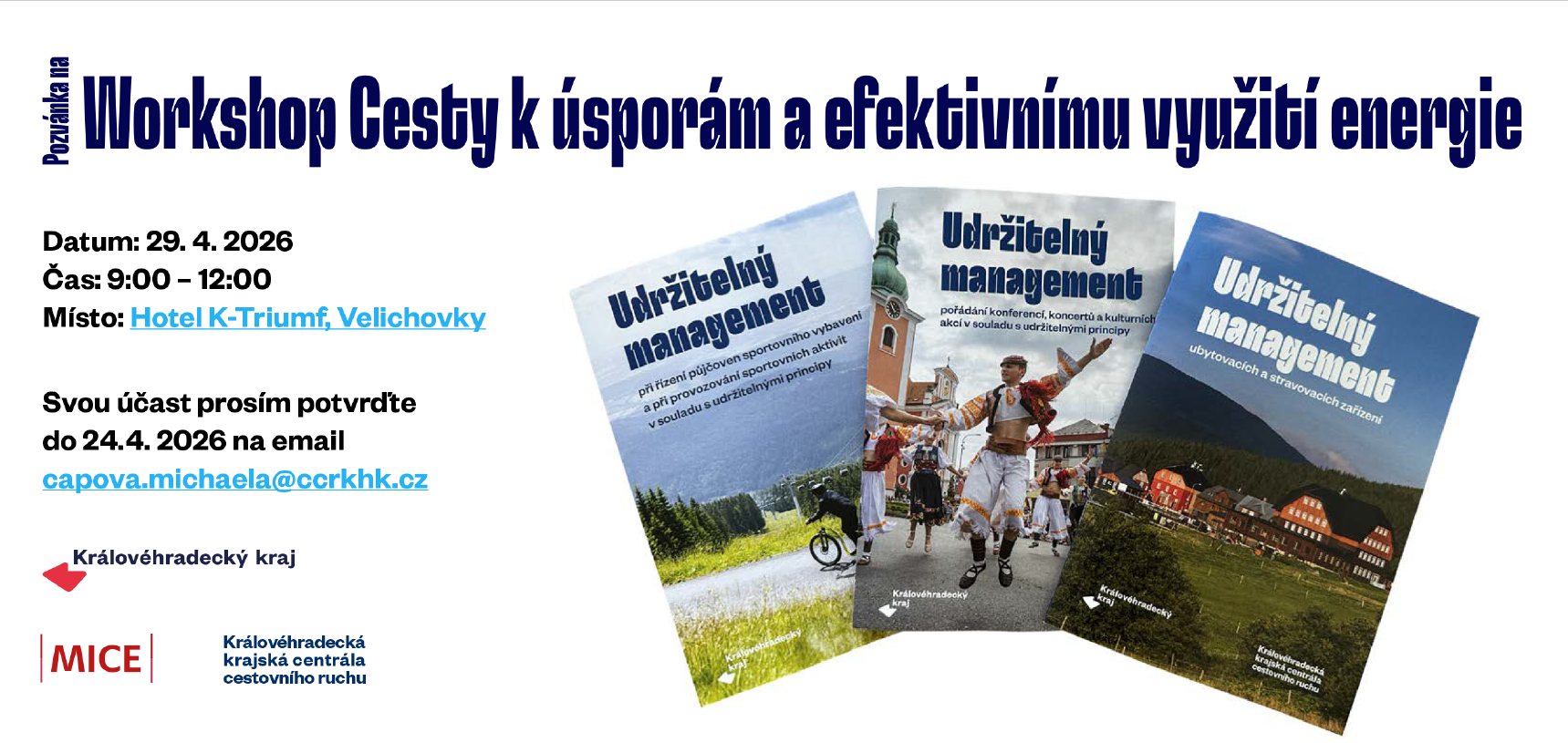Pokud se chcete workshopu zúčastnit, registrujte se do 24. 4. 2026 na e-mailu capova.michaela@ccrkhk.cz.