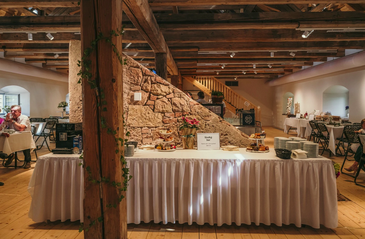 V přízemí zrekonstruované sýpky se nachází salónek a kavárna, která dotváří osobitou atmosféru celého prostoru. Salónek je ideální pro pořádání soukromých a nerušených akcí pro uzavřené společnosti. Terasa kavárny je navíc přímo propojena se zámeckým parkem.
